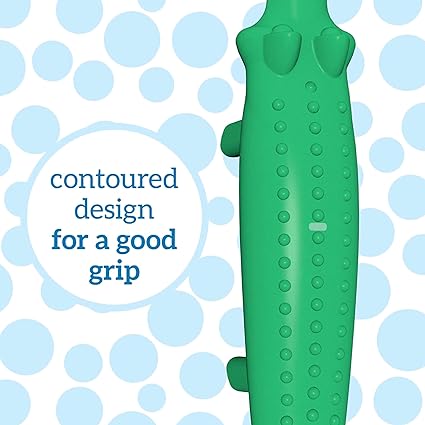 - Cepillo de dientes fácil de agarrar. La forma y el material del cepillo de dientes de cocodrilo son ideales para ayudar a los dedos pequeños a mantener un buen agarre mientras los ayuda a cepillarse.